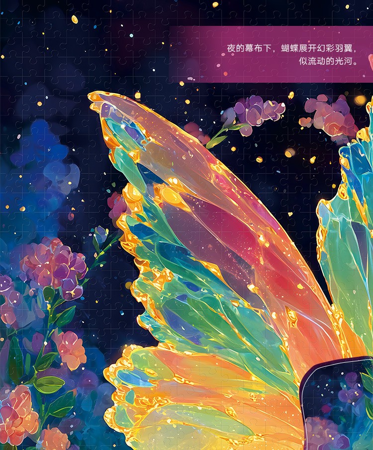 拼圖名稱:蝶夢花境-83125 拼圖尺寸:700*500MM 拼圖材質(zhì):紙質(zhì)灰卡 拼圖片數(shù):1000片 加工方式:廠規(guī)、來圖定制 包裝尺寸:180*130*50mm