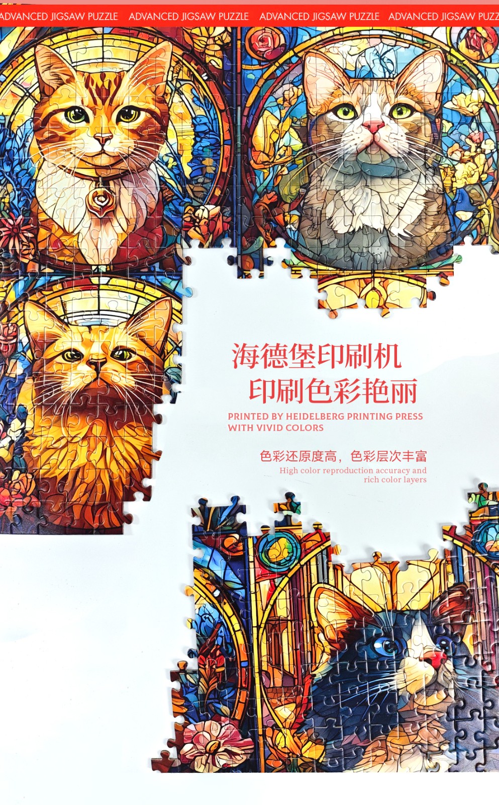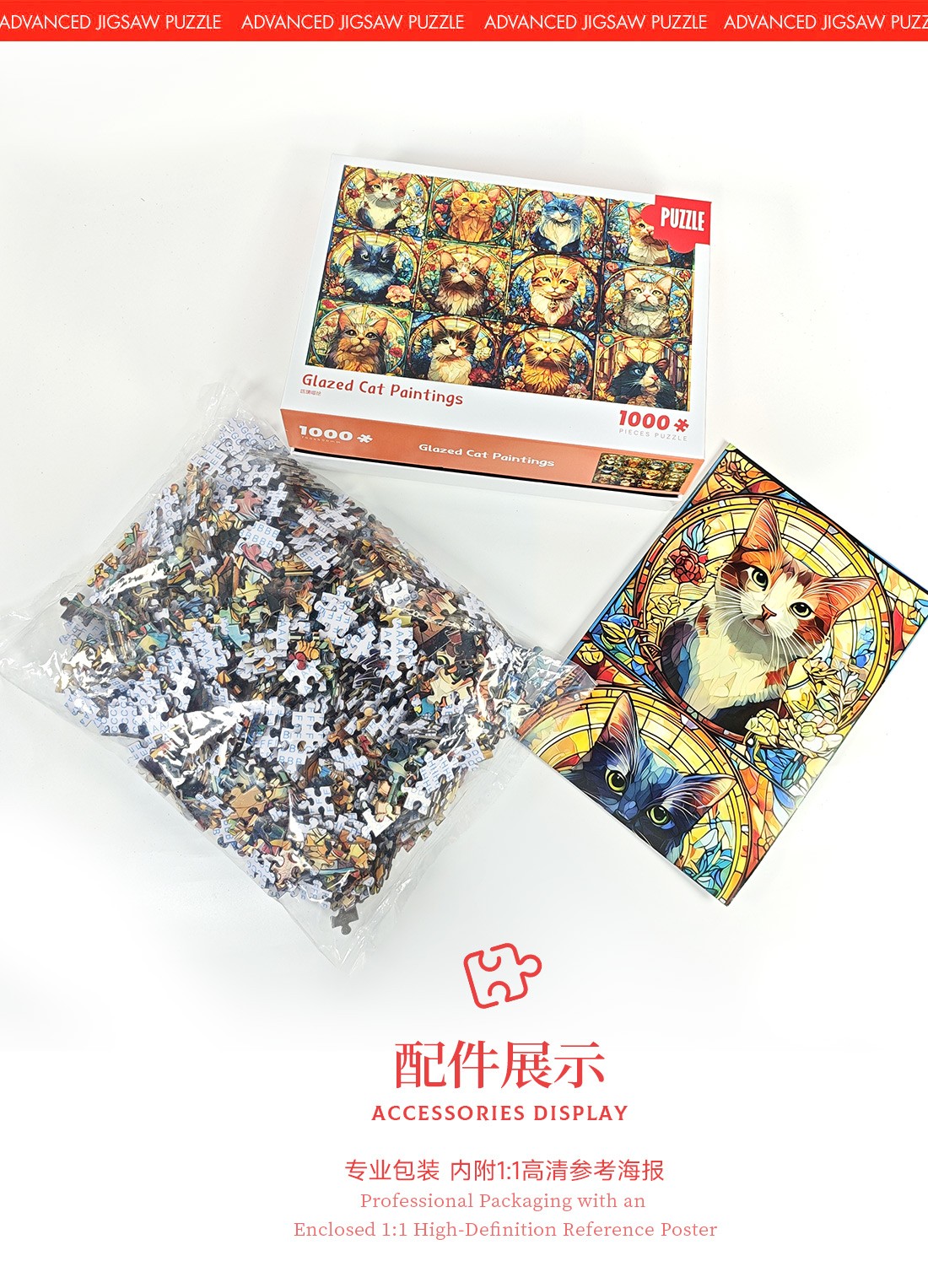 拼圖名稱:琉璃喵繪-83130 拼圖尺寸:700*500MM 拼圖材質:紙質灰卡 拼圖片數:1000片 加工方式:廠規、來圖定制 包裝尺寸:180*130*50mm