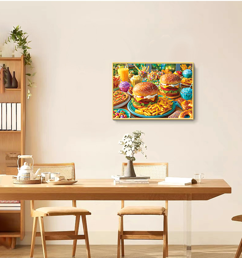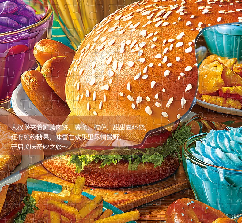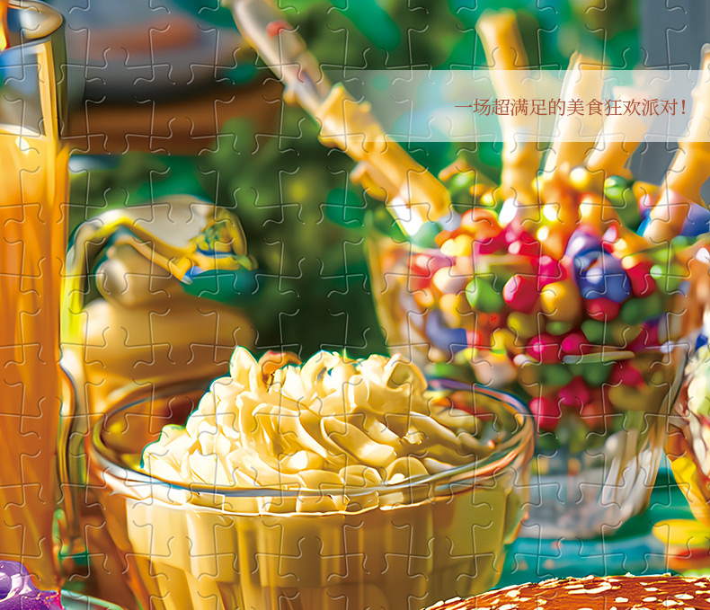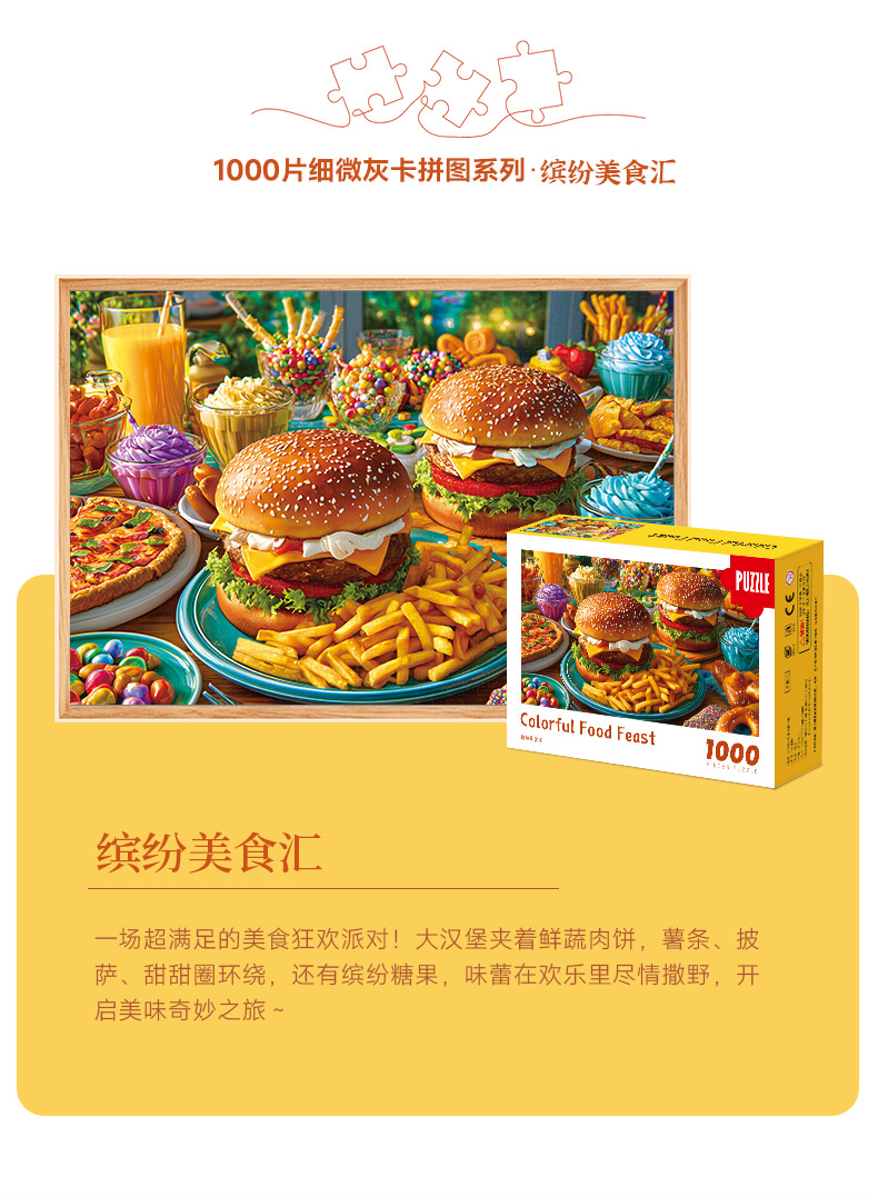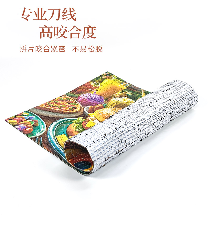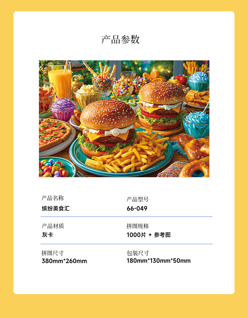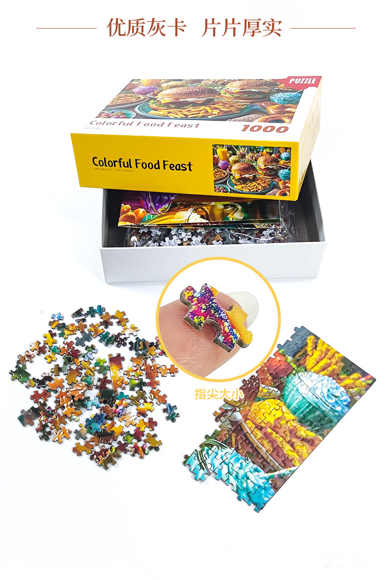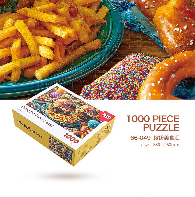 拼圖名稱:66-049繽紛美食匯 拼圖尺寸:380*260MM 拼圖片數:細微灰卡1000片 加工方式:廠規、來圖定制 包裝尺寸:180*130*50mm