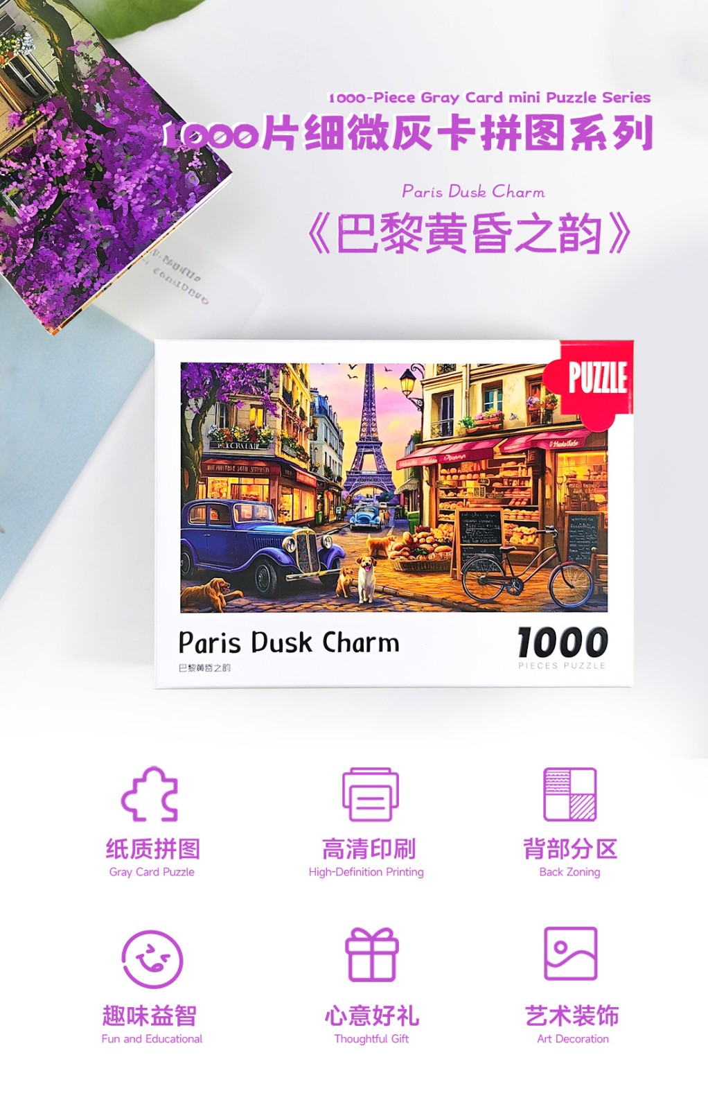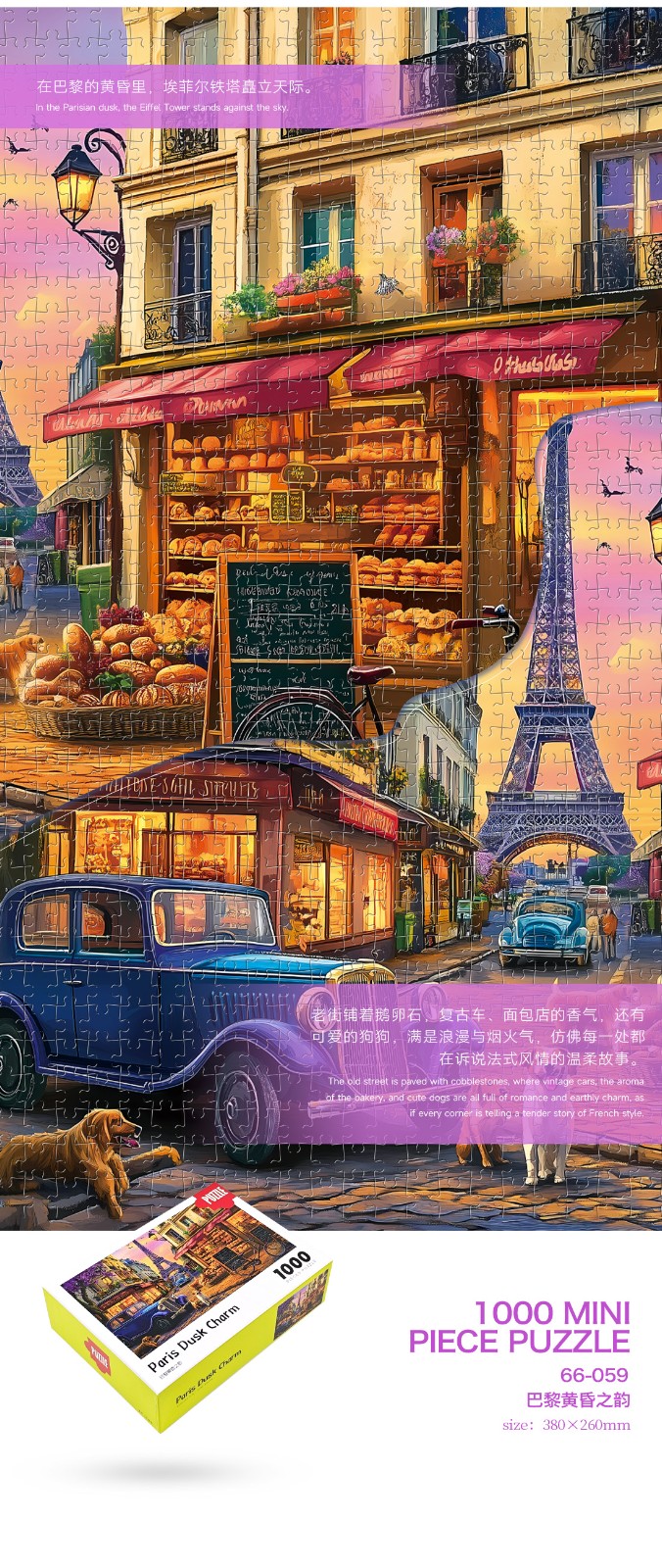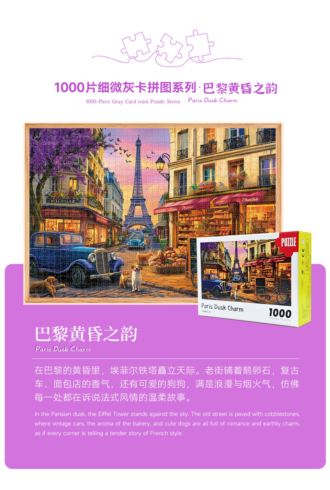 拼圖名稱:巴黎黃昏之韻 拼圖尺寸:380*260MM 拼圖片數(shù):細微灰卡1000片 加工方式:廠規(guī)、來圖定制 包裝尺寸:180*130*50mm