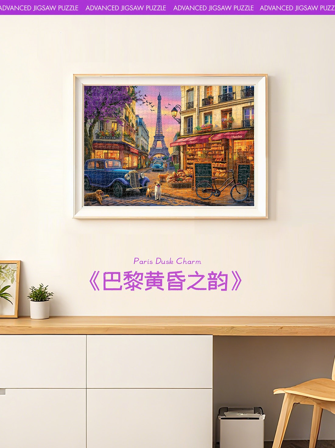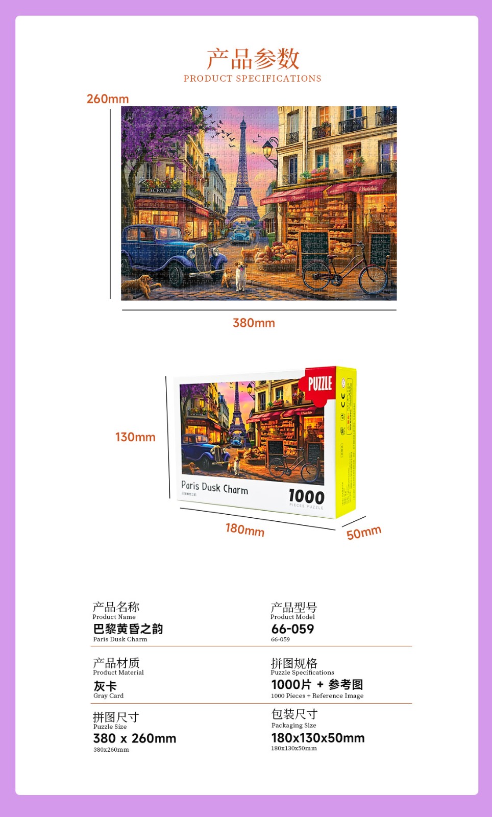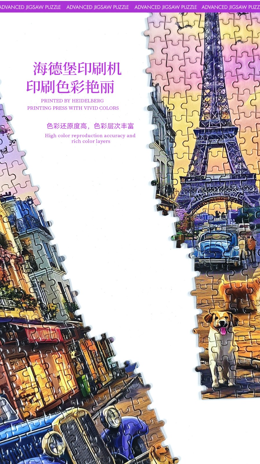 拼圖名稱:巴黎黃昏之韻 拼圖尺寸:380*260MM 拼圖片數(shù):細微灰卡1000片 加工方式:廠規(guī)、來圖定制 包裝尺寸:180*130*50mm