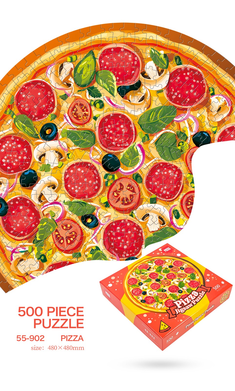 拼圖名稱:披薩-55-902 拼圖尺寸:480*480MM 拼圖材質(zhì):紙質(zhì)白卡 拼圖片數(shù):500片 加工方式:廠規(guī)、來圖定制 包裝尺寸:220*220*45mm