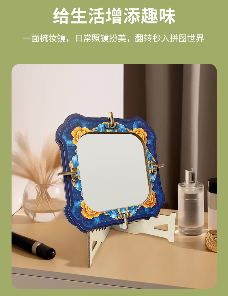 拼圖名稱:曼陀羅梳妝鏡拼圖 材質(zhì):木質(zhì) 拼圖尺寸:195*185*95mm 拼圖片數(shù):60/63片木質(zhì) 加工方式:廠規(guī)、來圖定制 包裝尺寸:190*190*40mm
