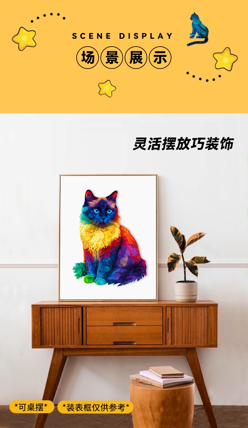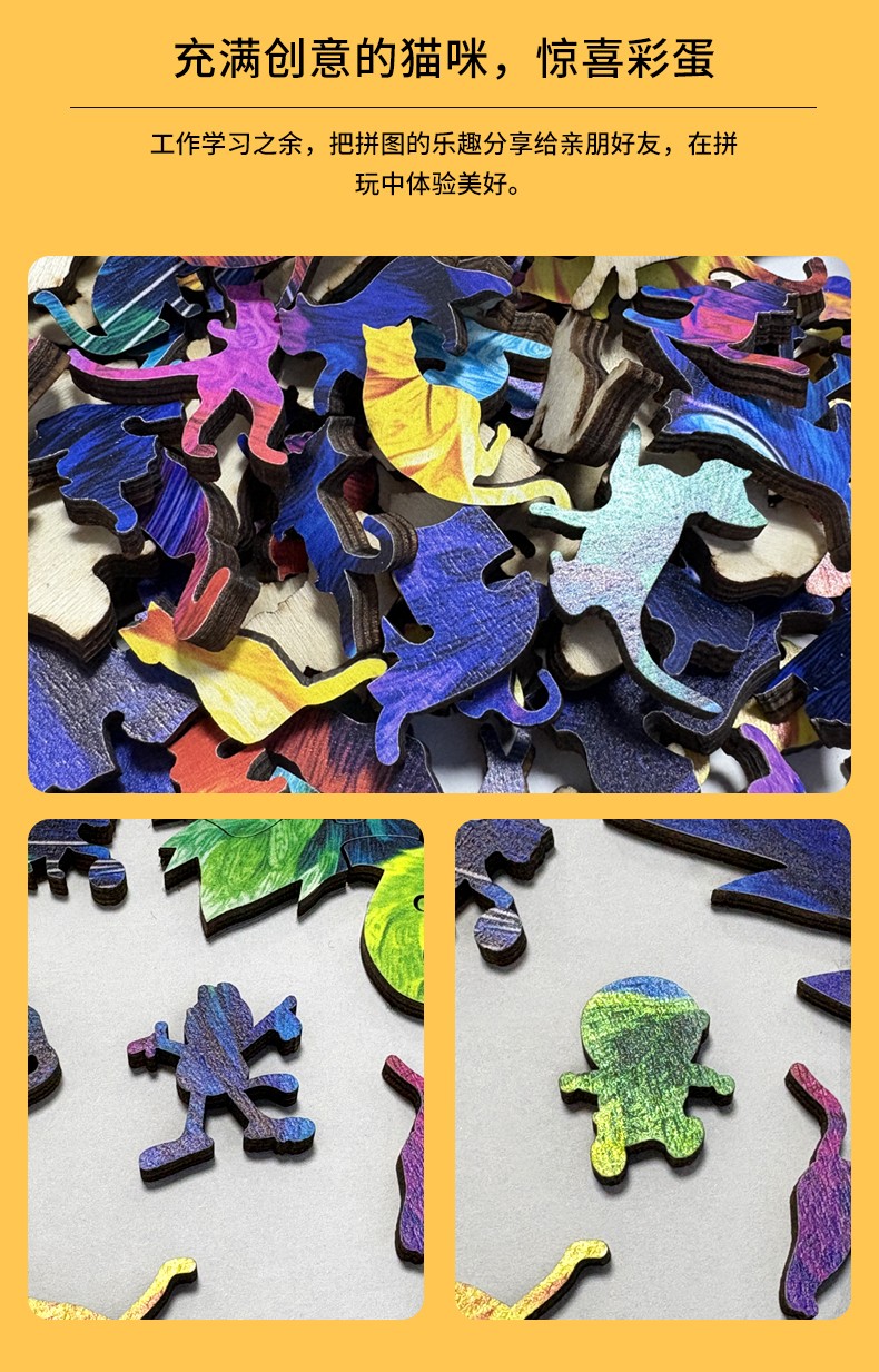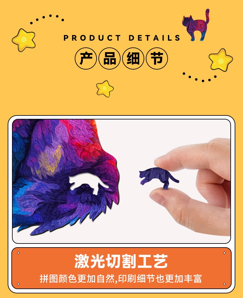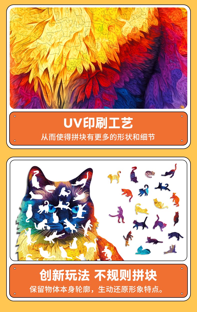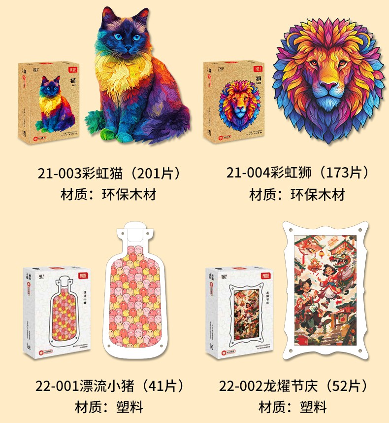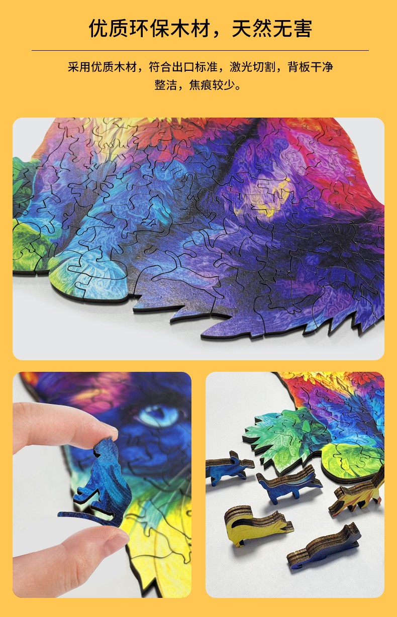 拼圖名稱:木制拼圖異形動物 拼圖尺寸:260*330*4.5MM 拼圖片數:201片 加工方式:廠規、來圖定制 包裝尺寸:220*160*45mm